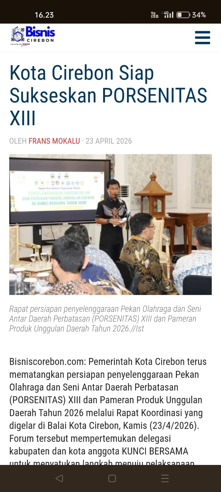 Cirebon Djalapaksinews — Pemerintah Kota Cirebon terus mematangkan persiapan penyelenggaraan Pekan Olahraga dan Seni Antar Daerah Perbatasan (PORSENITAS) XIII dan Pameran Produk Unggulan Daerah Tahun 2026 melalui Rapat Koordinasi yang digelar di Balai Kota Cirebon, Kamis (23/4/2026). Forum tersebut mempertemukan delegasi kabupaten dan kota anggota KUNCI BERSAMA untuk menyatukan langkah menuju pelaksanaan agenda bersama yang akan berlangsung pada 23–27 Juni 2026 mendatang.