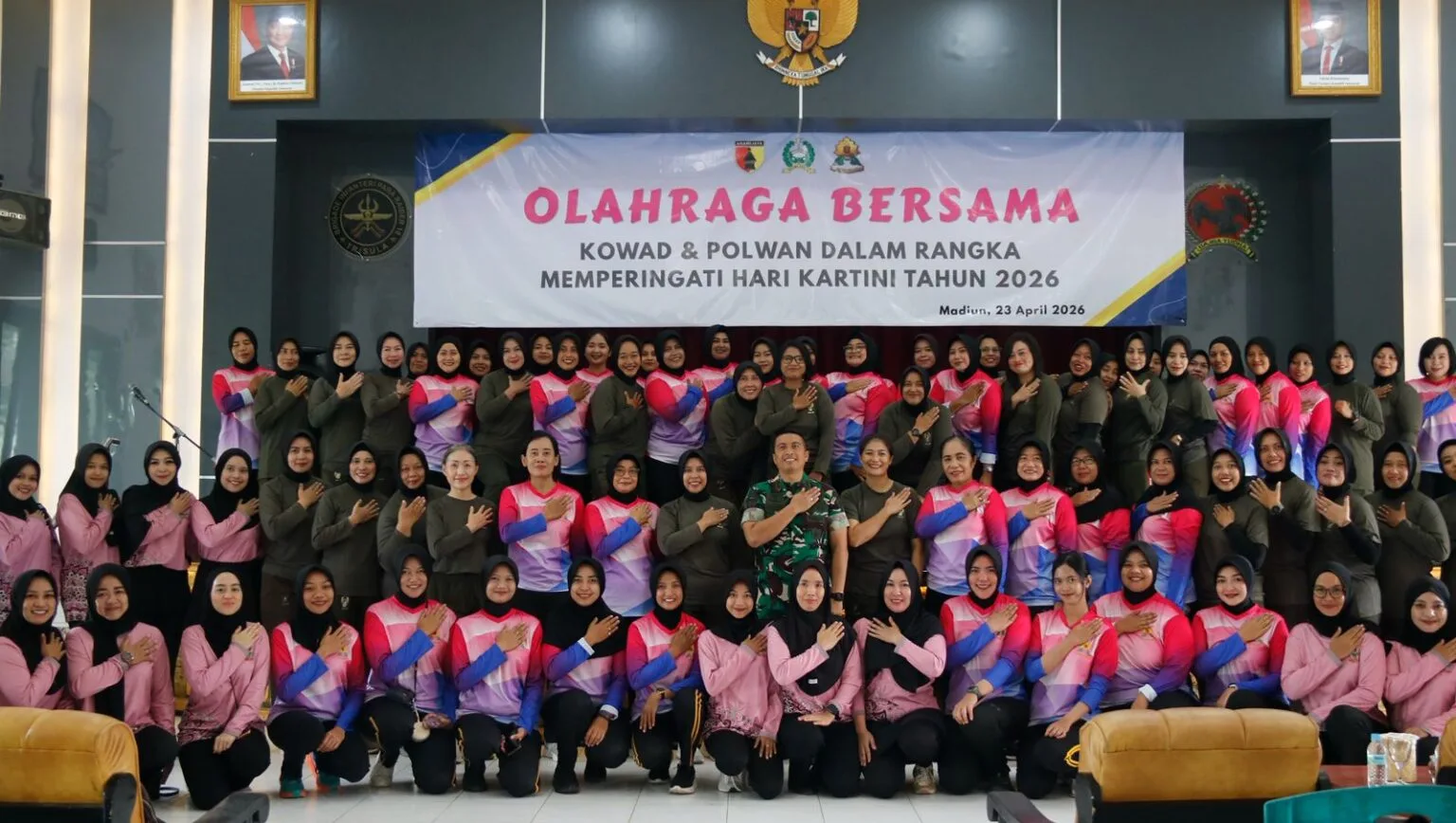 Madiun – //DJALAPAKSINEWS// – (24/04/2026), Dalam rangka memperingati Hari Kartini, Kowad dan Polwan di Madiun menggelar olahraga bersama di Markas Yonif Para Raider 501/Bajra Yudha, Kota Madiun, pada Kamis kemarin. Kegiatan diawali dengan senam bersama dan dilanjutkan dengan olahraga umum.